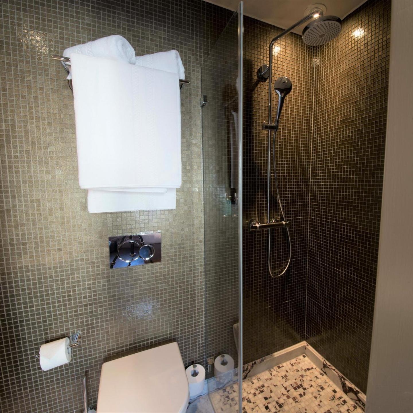 Shower really good Free warm cookies on arrival Breakfast nice - although overpriced at £19 Nice building & decor Iron in room